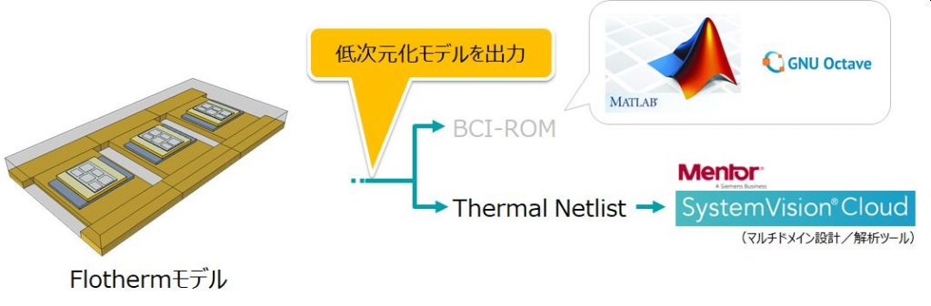 チップや基板形状から低次元化モデルを抽出します。必要な情報は、3D形状と境界条件(熱伝達係数)と物性値です。抽出した低次元化モデルは、回路シミュレーションツールと連携することができます。