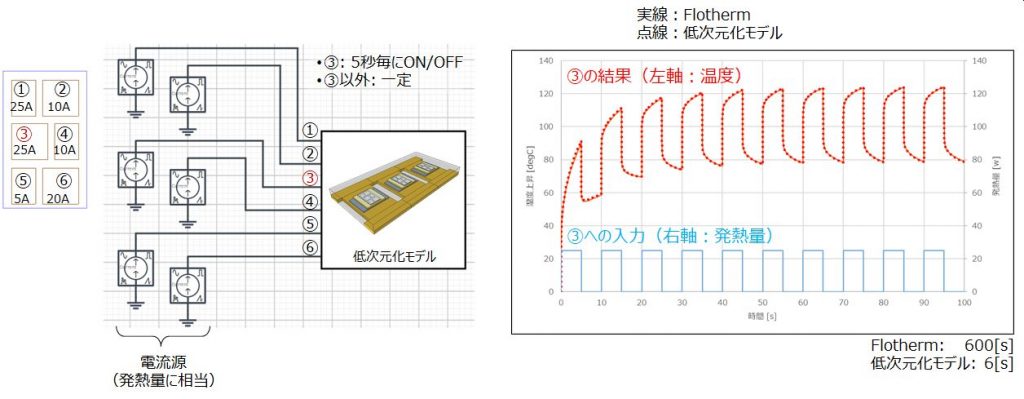 こちらは、100秒間の過渡解析のFlothermでの計算結果と、低次元化モデルでの計算結果を比較したものです。低次元化モデルはFlotherm結果を高精度に再現しており、かつ計算も高速です。この低次元化モデルによって、熱・電気回路の連成解析が現実的に可能であることがおわかりいただけることと思います。