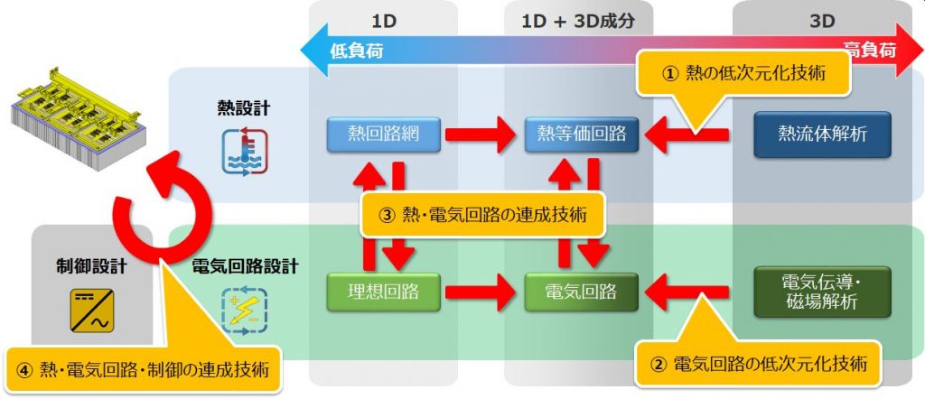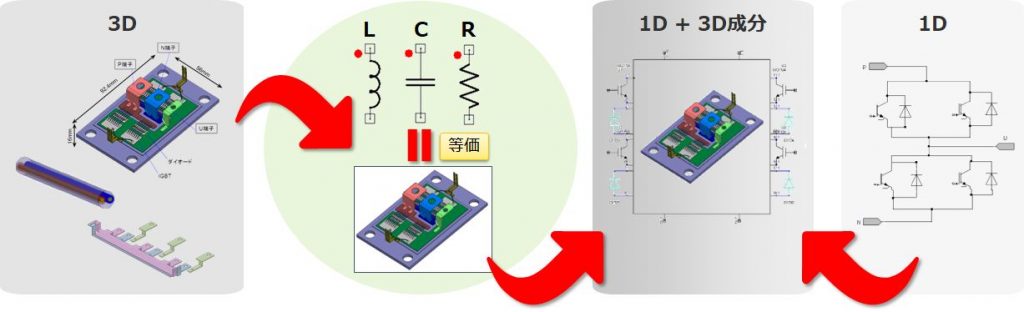回路の形状因子が熱的あるいは電気的な特性に及ぼす影響を考慮するには、3次元のシミュレーションが必要となります。しかし、詳細度の高い3Dシミュレーションは当然のことながら計算負荷が上がるため、詳細度はできるだけ落とさずに3Dの形状情報を抽出して1Dへ縮退化させる技術が必要となります。これが「低次元化」です。