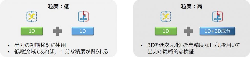 一方、熱側については、初期検討や低電流域での評価であれば粒度の低いモデルでも十分な精度が得られますが、電流の大きさによっては温度依存性が無視できないため、粒度の高いモデルが必要になる場合も考えられます。