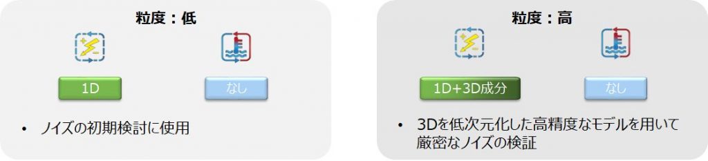ノイズレベルの電流・電圧変化による影響は小さいと考えられるため、電気回路側は粒度の低いモデルで十分に対応が可能です。