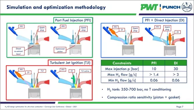 水素エンジン設計用1Dツール(GT-SUITE)のモデル構築において、3次元CFD(CONVERGE)結果を活用した事例です。燃焼モデルにはSAGEを採用し、反応メカニズムにNOxメカニズムを組み込むことで、NOx量によって水素の自着火時間が短縮される現象を考慮しています。その中でPFI(Port Fuel Injection、ポート噴射)、DI(Direct Injection、直噴)、TJI(Turbulent Jet Ignition、副室燃焼)の噴射方式を比較検討し、ピストン冠面形状を最適化したDIが熱効率や燃費の面で最も優れていることがわかりました。
