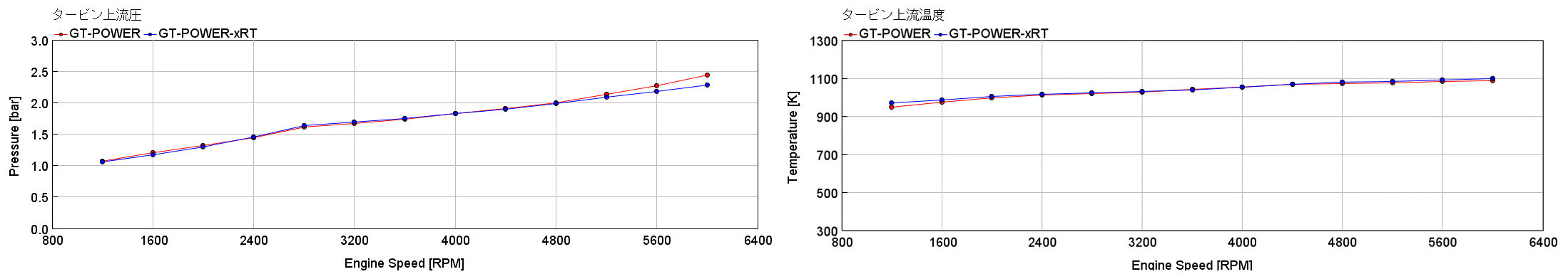 一般的にGT-POWER-xRTモデルの精度について語ることは難しいのですが、一例としてGT-POWERとGT-POWER-xRTの計算結果を比較してみます。図1でご紹介したモデルを対象に、GT-POWERとGT-POWER-xRTでの計算結果を比較しました。このモデルは6気筒のエンジンモデルでターボが付いており、ウエストゲートによるブースト圧制御をしています。ここでは純粋なソルバーの違いを示すため、GT-POWER-xRTモデルとして、いわゆる合わせ込みは行っていません。空気量やトルク、あるいは吸排気系の圧力や温度は概ね一致しており、また回転数ごとの傾向も合っています。またウエストゲート開度は、ブースト圧制御された結果の指示値です。ご注目いただきたいのは計算速度で、GT-POWER-xRTの方が、各回転数で10倍以上速くなっていることがわかります。