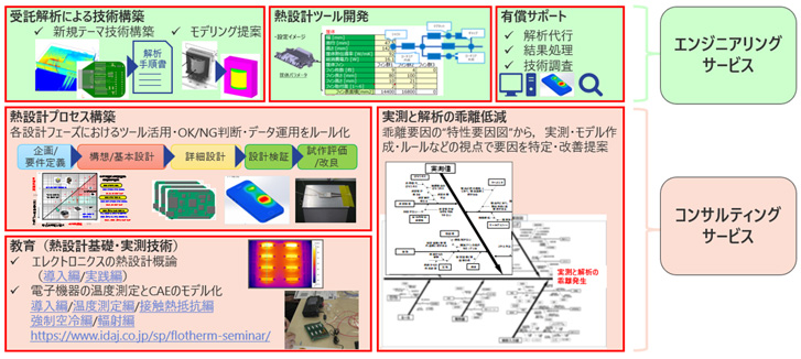 IDAJが保有する「ツール」と「人」は、お客様のさまざまな熱設計・熱解析に関する課題解決を支援するために、熱設計基礎、実測技術、解析精度改善、熱設計プロセス構築、等 「熱」全般をエンジニアリングサービスとコンサルティングサービスとしてご提供します。