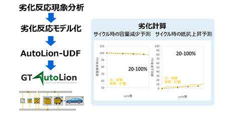 材料の物性は、粒子形状や添加剤の添加条件、電解液との組合せによってその値が変わるため、それぞれをGT-AutoLionの式で表現できるように独自のデータベースで定義して記述しました。これらにより設計したセルモデルを検証し、設計検討に利用可能なレベルにあることを確認しています。 - 続いて劣化の予測です。劣化反応についても着目したい劣化部分、またその反応が条件によって変わるため、ユーザー関数(註:User Defined Function、UDF)としてサブルーチンを用意して計算しました。GT-AutoLionは、ユーザーが着目したいモデルをサブルーチンとして容易に付加できるのが特長です。また、主要因の劣化モードを仮想的に組み合わせた評価ができるため、各劣化モードが組み合わさった場合の、容量の維持率や抵抗上昇予測も可能です。