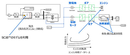 システムシミュレーションの適用例として、ハイブリット型の電動車両に対して電池の応用を検討したケースについてご紹介します。SCiB™の電池モデルはGT-AutoLionのモデルを活用して設計し、その他のハイブリッド車両のコンポーネントである発電機、ギア、エンジン、モータとSCiB™を接続してモデルを構築しています。 - 電池は、標準的なエネルギー容量とパワー密度を持っているセル①を基準に、セルのサイズを固定した条件で、電極を厚目付化し容量を重視した高容量セル②と、電極を薄膜化して出力を重視した高出力セル③という合計3種類のセルを仮想設計し、シミュレータの中に組み込んで特性を検証しました。