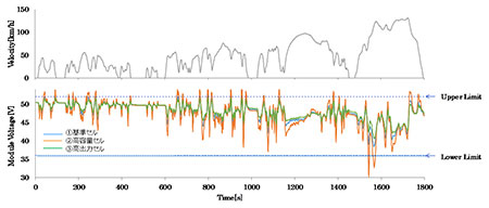 - 今回の検証では高容量型のセル②は、非常に大きな出力を要求されるときに下限電圧を下回る特徴が出現し、高出力セル③が適する結果となりましたが、低温始動特性を評価したり、運転パターンを変えて評価することで、システムに最も適した電池、そしてその電池の制御方法をデジタル上で把握することができます。