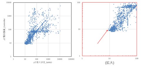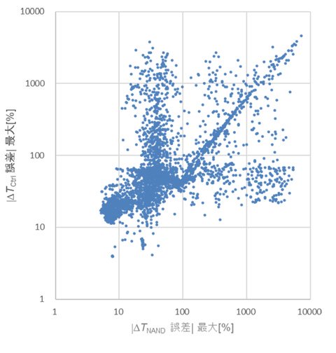 境界条件はTop側とBottom innerの熱伝達係数を200W/(m2・K)または400W/(m2・K)、Bottom outerの熱伝達係数を30W/(m2・K)または90W/(m2・K)とし、その組み合わせによって8通り設定しています。NANDとコントローラの発熱比は、3対7、5対5、7対3の3通りとし、計24通りの条件でシミュレーションを実施しました。 - 図3がシミュレーション結果の2次元散布図です。グラフの横軸がNAND、縦軸がコントローラにおける24条件での最大誤差の値を示しています。24通りの条件で各5,000回シミュレーションを行ったところ、誤差が10%以内となる複数の結果を得ることができました。