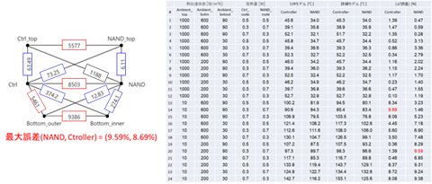 メモリ構造は、図2左下図のとおり、NANDとコントローラを横置きにした構造です。熱抵抗のノードは、Top側ではNANDとコントローラの各熱源の直上にそれぞれ1点ずつ、計2点設けました。Bottom側では、UFSメモリの特徴であるはんだBall(注:信号端子)の有無に基づき、はんだBallを有する範囲をBottom inner、有さない範囲をBottom outerと定義し、それぞれにノードを設けました。そして、これらのノードを熱抵抗で結ぶ11抵抗モデルを作成しました(図2左上)。