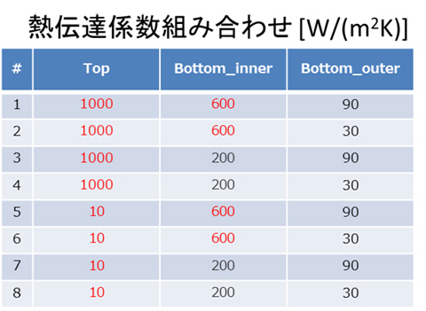 - 次に、UFSメモリがスマートフォンに多く採用されている点を踏まえて、より多様な電子機器の熱設計に対応できるよう、境界条件の範囲を拡張したシミュレーションを行いました。ここでは、Top側の熱伝達係数の値が極端に異なる場合でも、詳細モデルを用いたシミュレーションの結果と簡易熱抵抗モデルを用いたシミュレーション結果の誤差が10%以内に収まるかどうかを検証しました。
