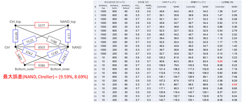 境界条件はTop側とBottom innerの熱伝達係数を200W/(m2・K)または400W/(m2・K)、Bottom outerの熱伝達係数を30W/(m2・K)または90W/(m2・K)とし、その組み合わせによって8通り設定しています。NANDとコントローラの発熱比は、3対7、5対5、7対3の3通りとし、計24通りの条件でシミュレーションを実施しました。 - 図3がシミュレーション結果の2次元散布図です。グラフの横軸がNAND、縦軸がコントローラにおける24条件での最大誤差の値を示しています。24通りの条件で各5,000回シミュレーションを行ったところ、誤差が10%以内となる複数の結果を得ることができました。