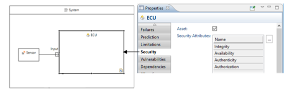 サイバー攻撃の標的になりうる重要な資産を、SysMLのシステムアーキテクチャモデル上でアセットとして分類します。セキュリティの基本3要素であるCIA=Confidentiality(機密性)・Integrity(完全性)・Availability(可用性)に加えて、Accountability(責任追跡性)、Authenticity(真性性)などを、アセットのセキュリティ基準として設定することができます。