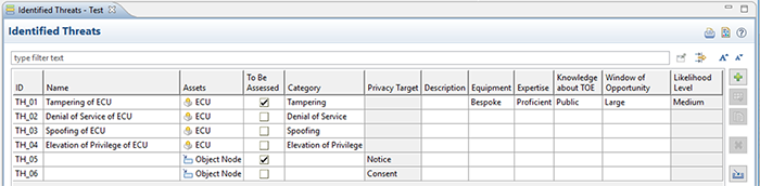 アセットにSTRIDE手法を適用して脅威を特定します。STRIDEは脅威分析手法の1つで、アセットに対して予測される攻撃手法を6パターンに分類します。STRIDEの分類は、アセットのセキュリティ属性から自動マッピングすることができ、また脅威の発生可能性(Likelihood Level)の設定が可能です。