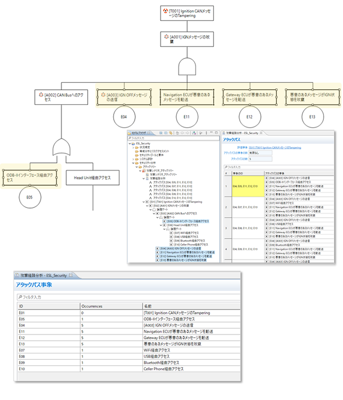構築したアタックツリーから脅威が顕在化する攻撃パタン(アタックパス)を抽出したり、各アタックパスに含まれる攻撃の出現頻度を確認することができます。