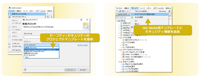 ISO 26262で求められる安全性分析と、ISO/SAE 21434で求められるセキュリティ分析を統合して実施することを想定したプロジェクトテンプレートが提供されています。また、既存のISO 26262のテンプレートにセキュリティ分析機能を追加することも可能です。
