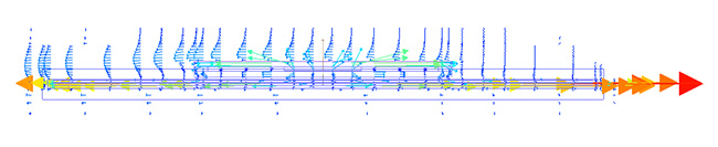 固体表面の温度分布や任意断面での温度、速度分布、ファンなどからの流跡線を表示することができます。また、形状や流体を伝わる熱流束や放熱経路のボトルネックを表示することができるなど、熱設計に有効な結果を得ることができます。もちろん、モデル内の各物理量の値はデジタル値として確認でき、csvファイルとして出力することが可能です。