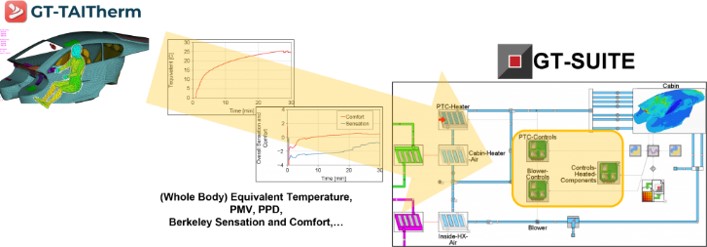 GT-TAIThermの人体の快適性モデルは、HVAC制御の目標値として使用することができます。温度と湿度は、キャビン内での人間の快適性に関する方程式の一部として表されるため、最適化の目標値とすることが可能です。人体の快適性は、Berkeley Comfortモデルを用いて計算され、PMV、PPDといった指標としても結果出力することができます。